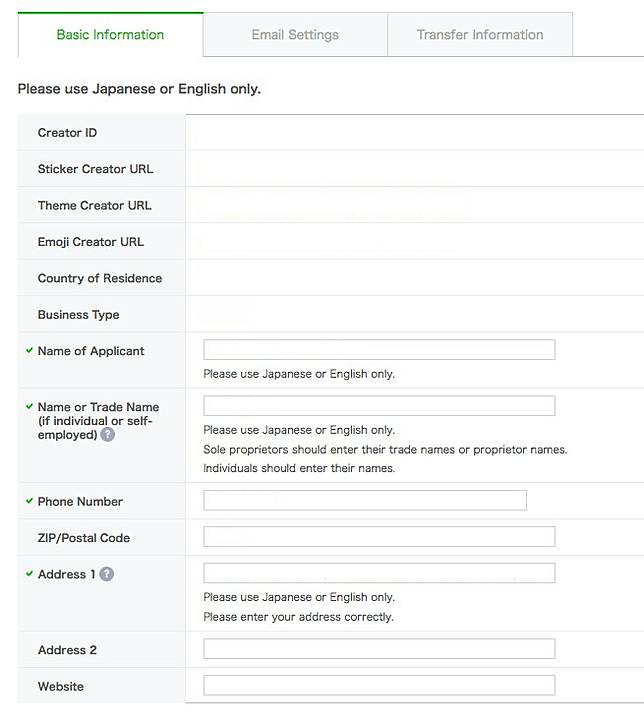 2. ข้อมูลเบื้องต้นที่ลงทะเบียนบนระบบ LINE Creators Market กับข้อมูลในเอกสารเกี่ยวกับสนธิสัญญาทางภาษีต้องเป็นภาษาอังกฤษหรือภาษาญี่ปุ่นเท่านั้น